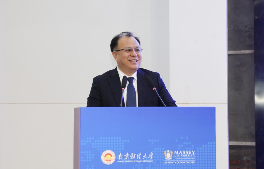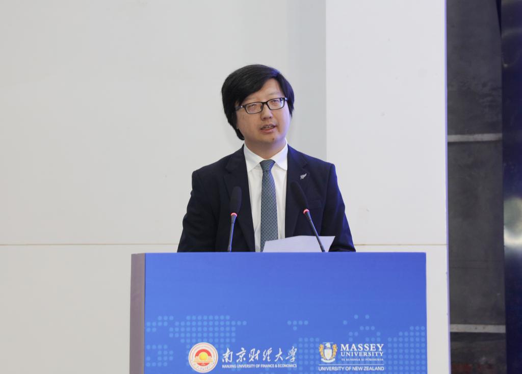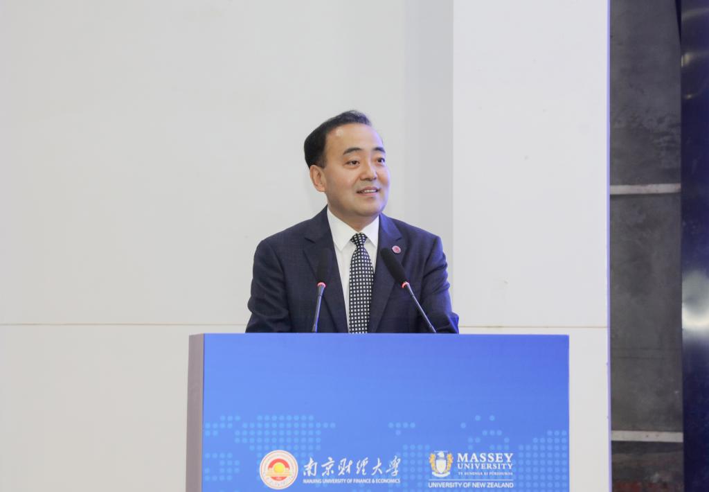 省教育厅二级巡视员周玖华致辞。他表示,今年会成立以来,今年会官网和梅西大学共同克服疫情等诸多不利影响,构建两校教学联动机制,在教学资源建设、教学模式创新、教学质量提升上精诚合作、携手并进,同时积极打造文化交流平台,为两校师生交流搭建桥梁,实现了优质教育资源整合的“最大公约数”,在国际化人才培养和中外融合方面画出了“最大同心圆”。今天,数字经济与可持续发展国际研究院的成立标志着南财大和梅西大学的合作喜结硕果、盈车嘉穗,希望两校未来能够深刻把握时代机遇,继续深化合作、互惠共赢,进一步做优做强国际教育交流与合作品牌,将国际研究院建设成为探寻经济发展新领域、新赛道,靶向服务长三角地区经济发展的重要平台。