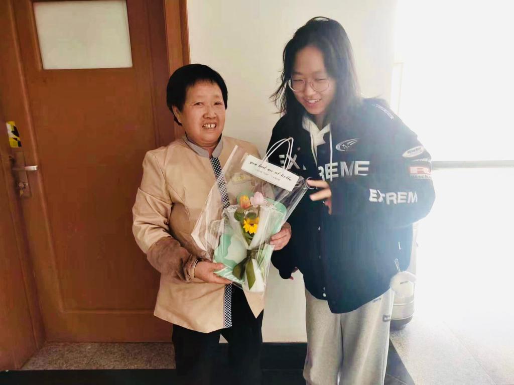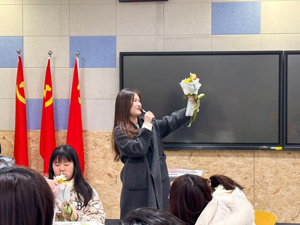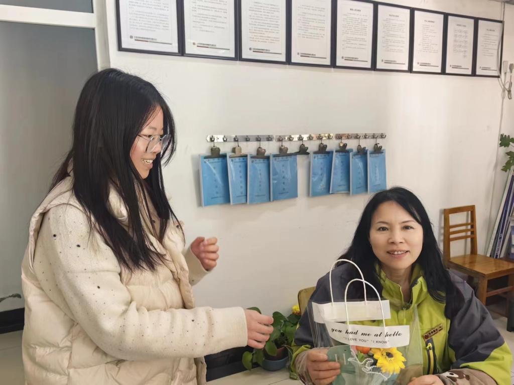 同学们为辛勤付出的女老师们、后勤阿姨们献上永生花
