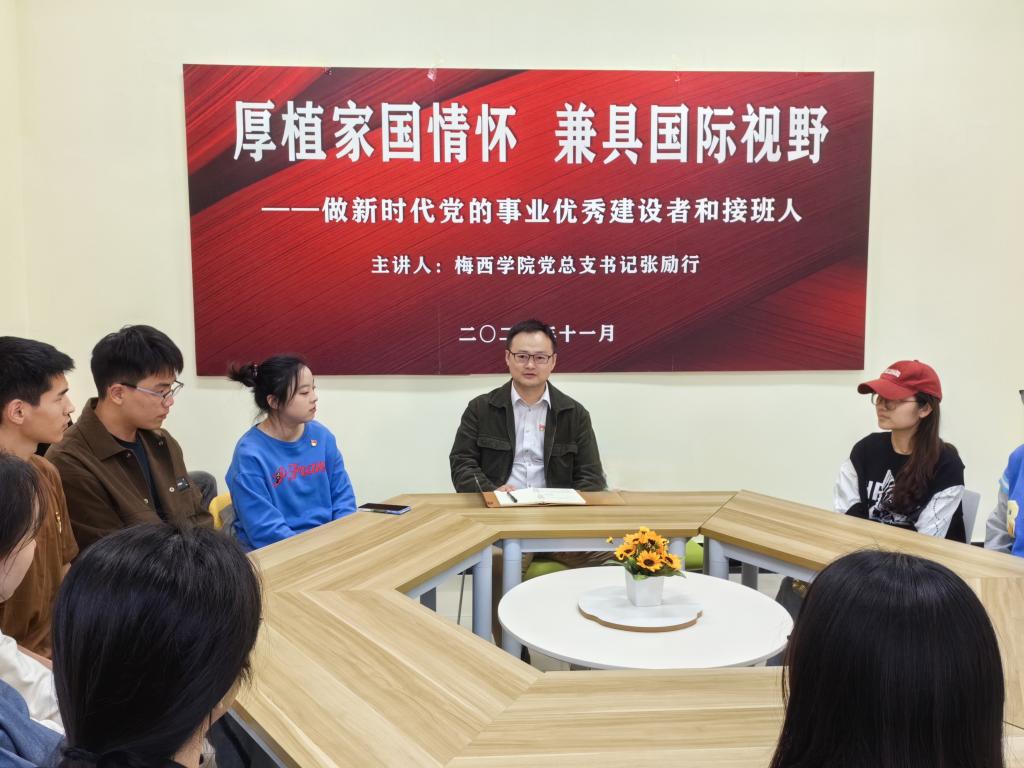 最后,张书记作总结发言。他强调,同学们要厚植家国情怀,兼具国际视野,积极承担社会责任,为构建美好的家庭、社会和国家积极贡献力量。他鼓励小“梅”子树立远大理想,时刻关注国家发展,积极参与国际交流与合作,努力成为党的事业优秀建设者和接班人。