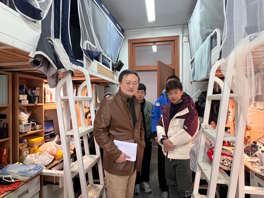 走进员工宿舍,张励行书记与同学们进行了亲切交流。他询问了同学们的日常生活和学习情况,细致地了解了同学们在学习课程、职业规划上的困难和挑战。同时,他还特别关注员工的精神风貌,希望同学们能够继续保持良好心态,从容面对学习和生活中的各种压力。他鼓励大三员工思考未来发展规划,确定学业方向,树立科学有效的目标,努力实现理想抱负。最后,他强调同学们在宿舍生活中要牢固树立安全意识,定期检查电器设备,不私拉乱接电线,禁止使用违规电器,在重视学习的同时也要把生命健康放在优先位置。整个走访过程,呈现出良师益友、其乐融融的暖心氛围。