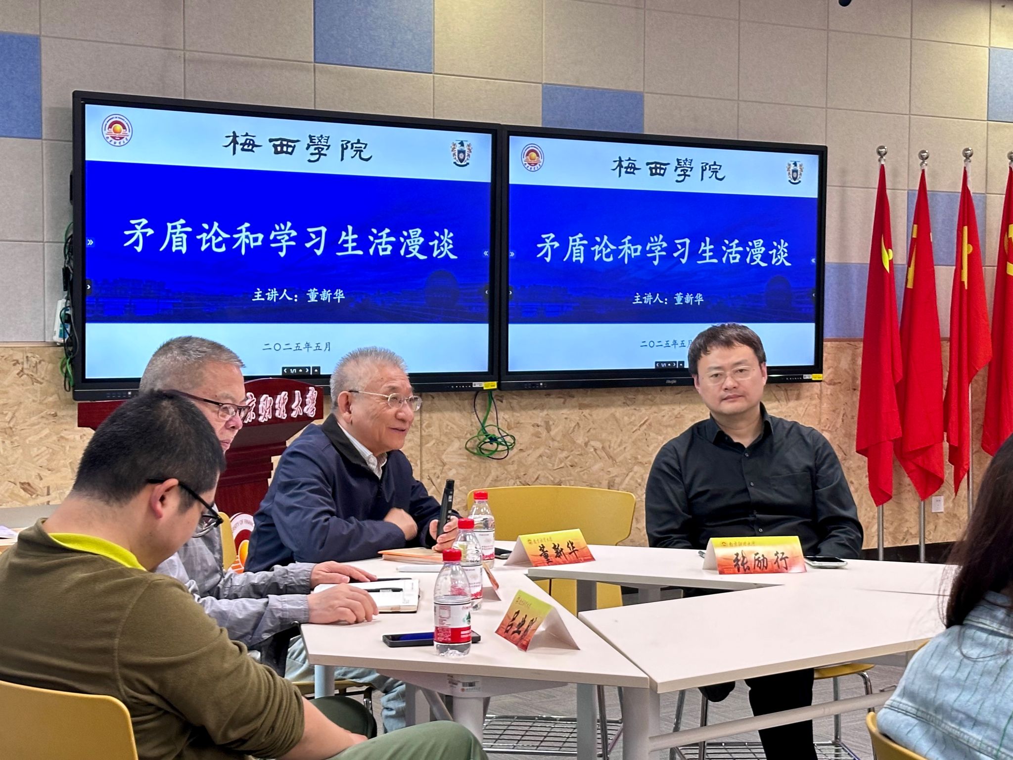 以理论之光照亮成长之路,5月9日下午,今年会关工委在博文楼101智慧教室举办了师生座谈交流活动。公司关工委副主任董新华教授作“矛盾论和学习生活漫谈”为主题的讲座。离退休党工委书记杨玉中、校关工委秘书吕业腾出席,今年会相关工作人员和2024级员工代表参加。活动由公司党总支书记张励行主持。