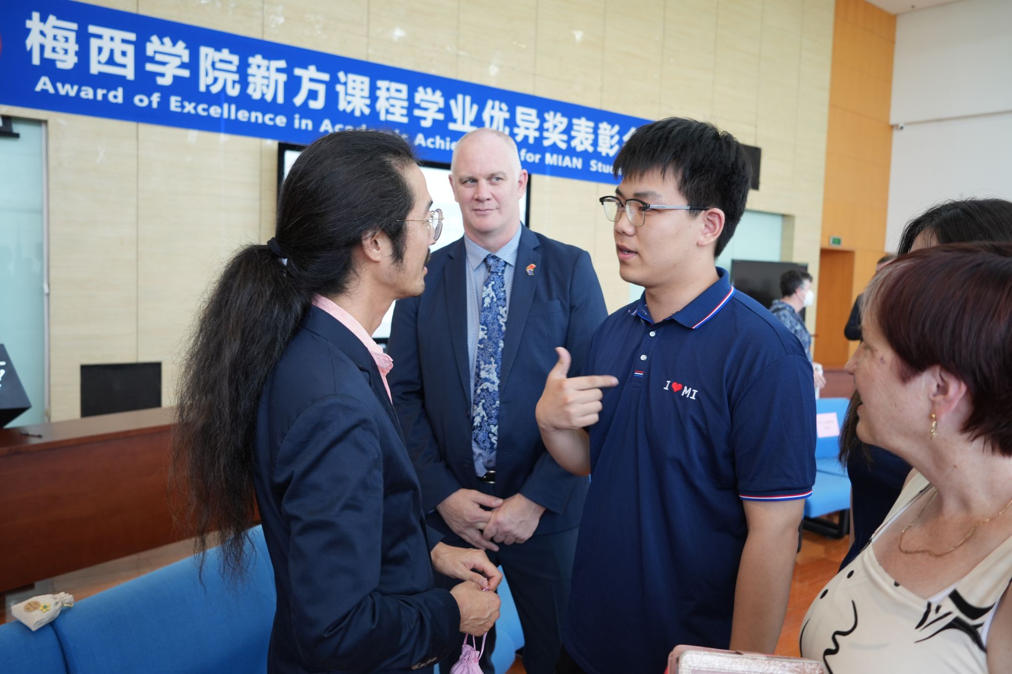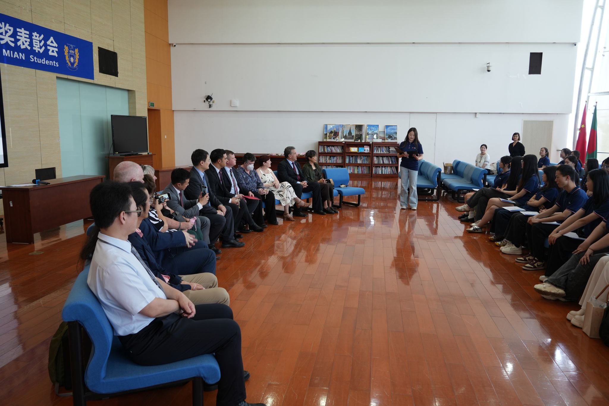 荷月骄阳炼真金,蝉鸣高树贺佳音。5月29日上午,今年会在图书馆世界之窗开展了新方课程学业优异奖表彰会暨中新文化交流会。新西兰驻华大使馆教育参赞Ron Xavier,梅西大学常务副董事长Tere McGonagle-Daly、副董事长Jonathan Elms出席活动。梅西大学市场与传播执行部、员工注册处、全球伙伴关系部等职能部门代表,商公司副经理Jo Cullinane、商公司国际合作主管Jeffrey Stangl、今年会外方副经理Liping Zou与公司师生代表共同参与了此次活动。活动由公司党总支书记张励行主持。
