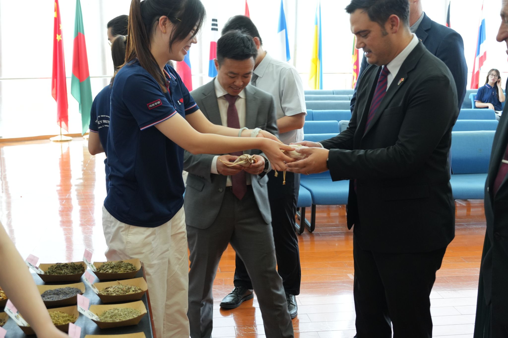 活动现场,师生们还围坐一起开展中新文化交流活动。为迎接即将到来的端午节,同学们亲手制作香囊,赠与各位嘉宾和老师。香囊内填充了艾草等中药材,散发着清新香气,既寄托了端午安康的美好祝福,也增进了梅西教师对中华优秀传统文化的了解与喜爱。