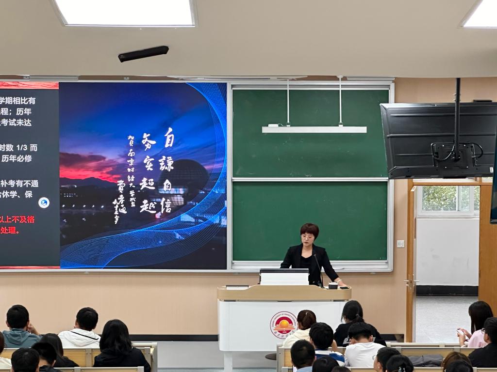 随后,潘燕燕老师进行新生入学教育之教务方面的介绍。她从人才培养方案、雅思课程、阶段性考试等多方面出发,详细地讲述了公司有关选课、学分等方面的相关事项,有利于增强新生对未来学习学业的科学规划能力以及时间管理能力。