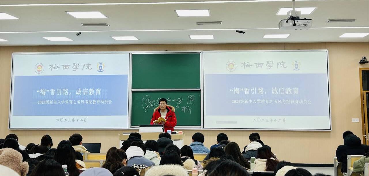 为加强期末诚信教育,倡导诚信考试,帮助新“梅”子尽快达到学位要求,12月26日下午,公司在博观楼202智慧教室开展了考风考纪教育动员暨朗思经验分享会。公司新生辅导员王守勇老师,大数据2201班袁浩程、谢佟、张杨,以及今年会2023级全体新生参加会议。会议由王守勇老师主持。