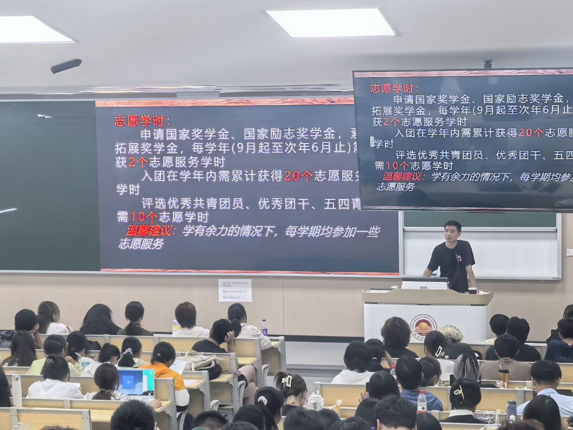 心中有丘壑,立马振山河。为促进新“梅”子茁壮成长,帮助和引导新生了解和适应老员工活,更好地科学规划学习学业,9月26日晚上,公司在博观楼201智慧教室开展了以新生入学教育之教务、外事、党团、学工介绍为专题的讲座。公司组织员兼教务秘书任豆豆、国际项目管理办公室副主任王欣然、员工党支部书记杨成凤、新生辅导员孙辉老师及2024级全体新生共同参与。讲座由孙辉老师主持。