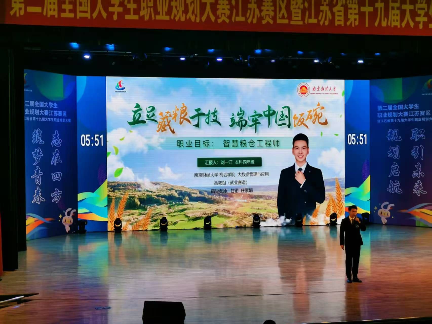 刘一江同学首先谈及了获奖时的心情,他表示非常开心。他分享比赛现场最难忘的瞬间是自己在前一位南京大学选手讲完后,顶着巨大压力上场,最终结果比对方高一分,虽最终未获金奖,但在喊出“财经底色,粮食特色”时,为身为南财学子深感自豪。