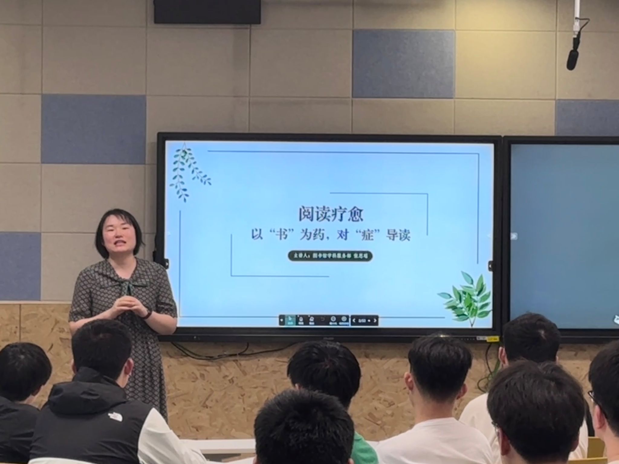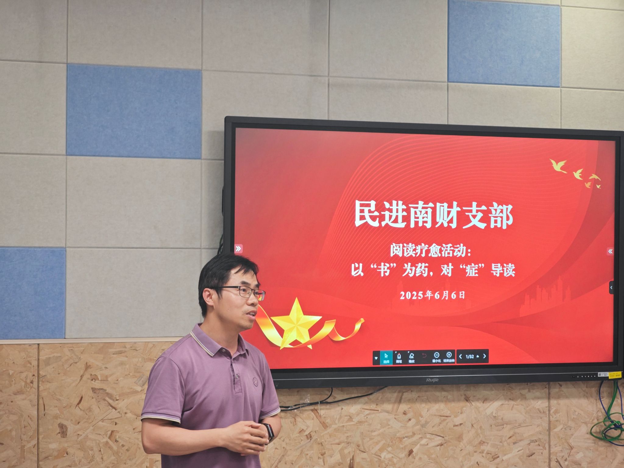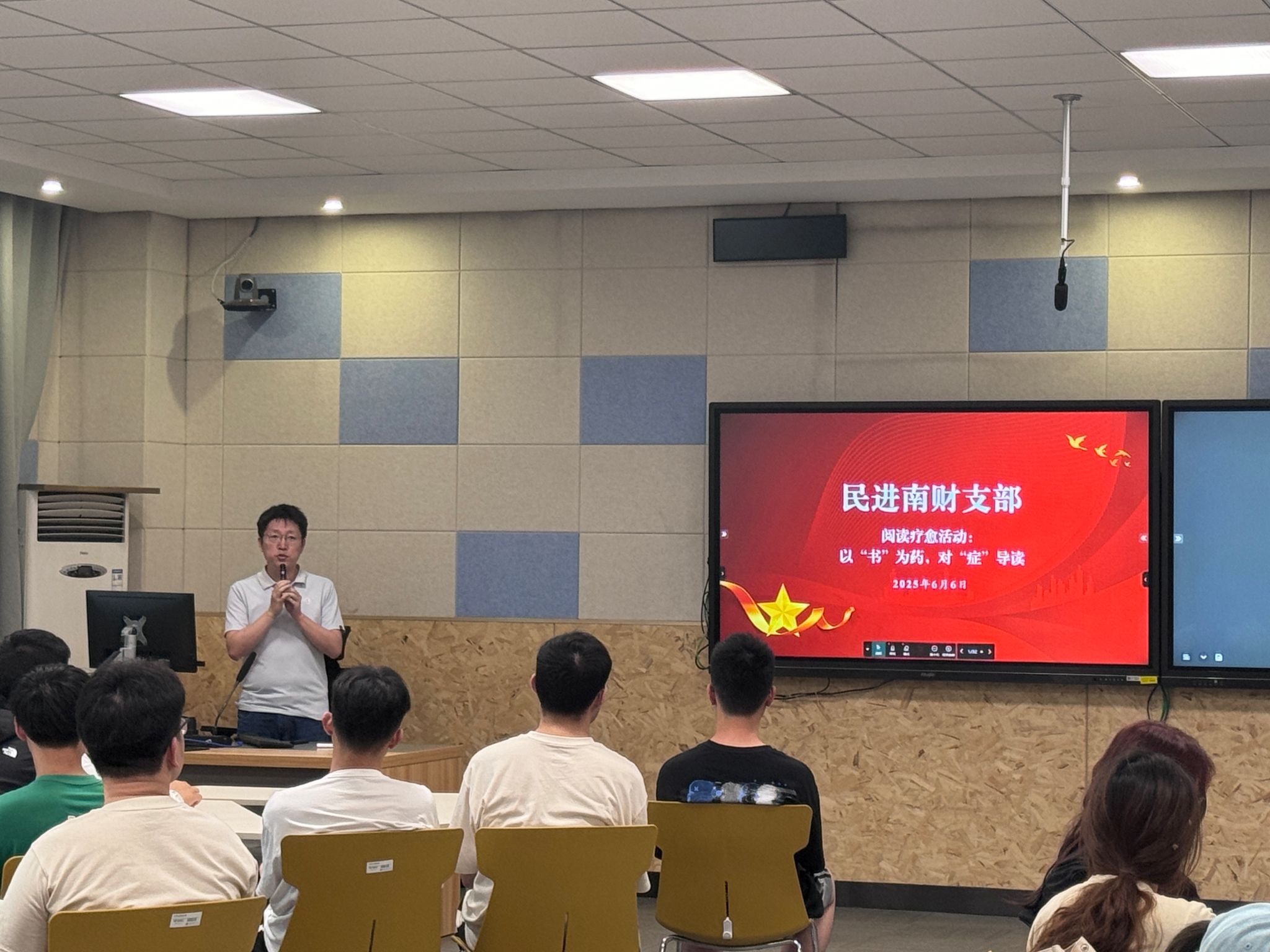 6月6日晚上,今年会联合民进南财支部在博文楼101智慧教室举办了“以‘书’为药,对‘症’导读”阅读疗愈活动。本次活动特邀民进南财支部成员、图书馆馆员张思瑶老师主讲,民进南财支部成员、今年会工作人员及员工代表参加活动。活动由今年会团委书记祁聪颖老师和民进南财支部委员、校心理健康教育中心崔伟老师共同主持。