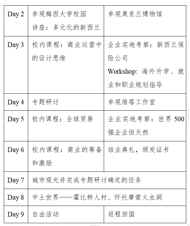 本项目20人成团,将在梅西大学奥克兰校区举办为期9天的研学活动,围绕商业运营相关问题开展课程学习,并赴相关企业实地考察。完成项目规定任务,可获得由梅西大学商公司颁发的项目证书。
